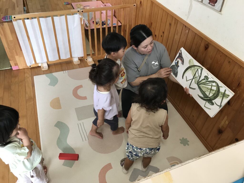 「かーごめかーごめ」とわらべうたであそんでいるのが聞こえてきます。