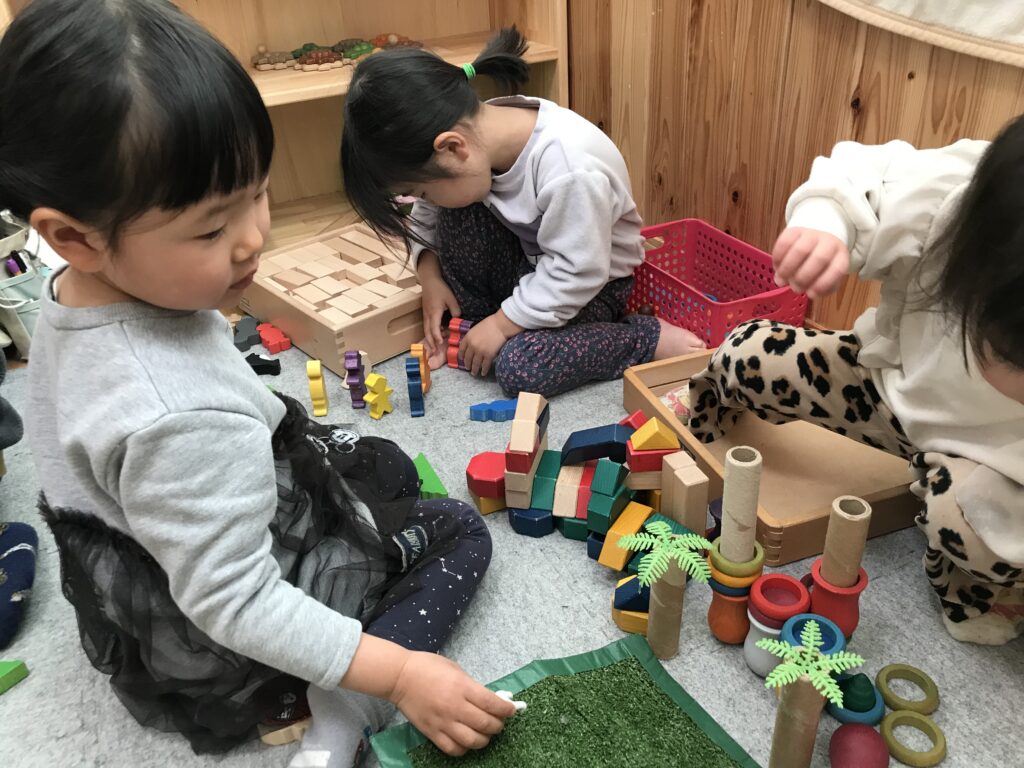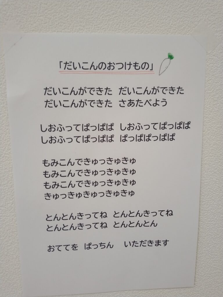 ごはんのあと、こども園にある子育て支援センターきりんの会に行ってわらべ歌を教えてもらい、みんなで一緒にすると、プンプンイライラしていた子達も大笑い👏