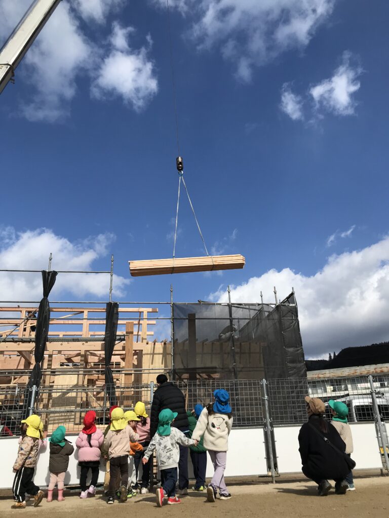 発達支援室の棟上げをみんなで見守り、お祝いをしました。