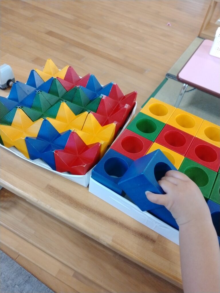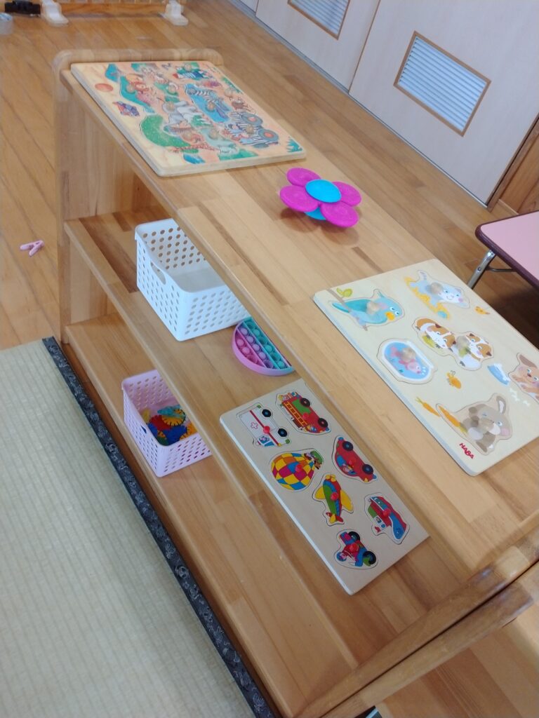 各クラスにはいつでも選んで遊べるおもちゃ棚が配置されています